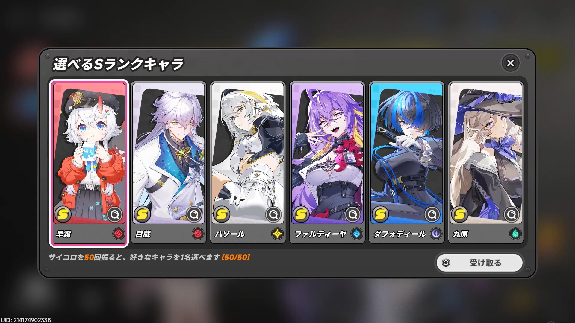 なお、恒常ガチャは50連すると、好きな恒常Sレアキャラを1人もらえます。