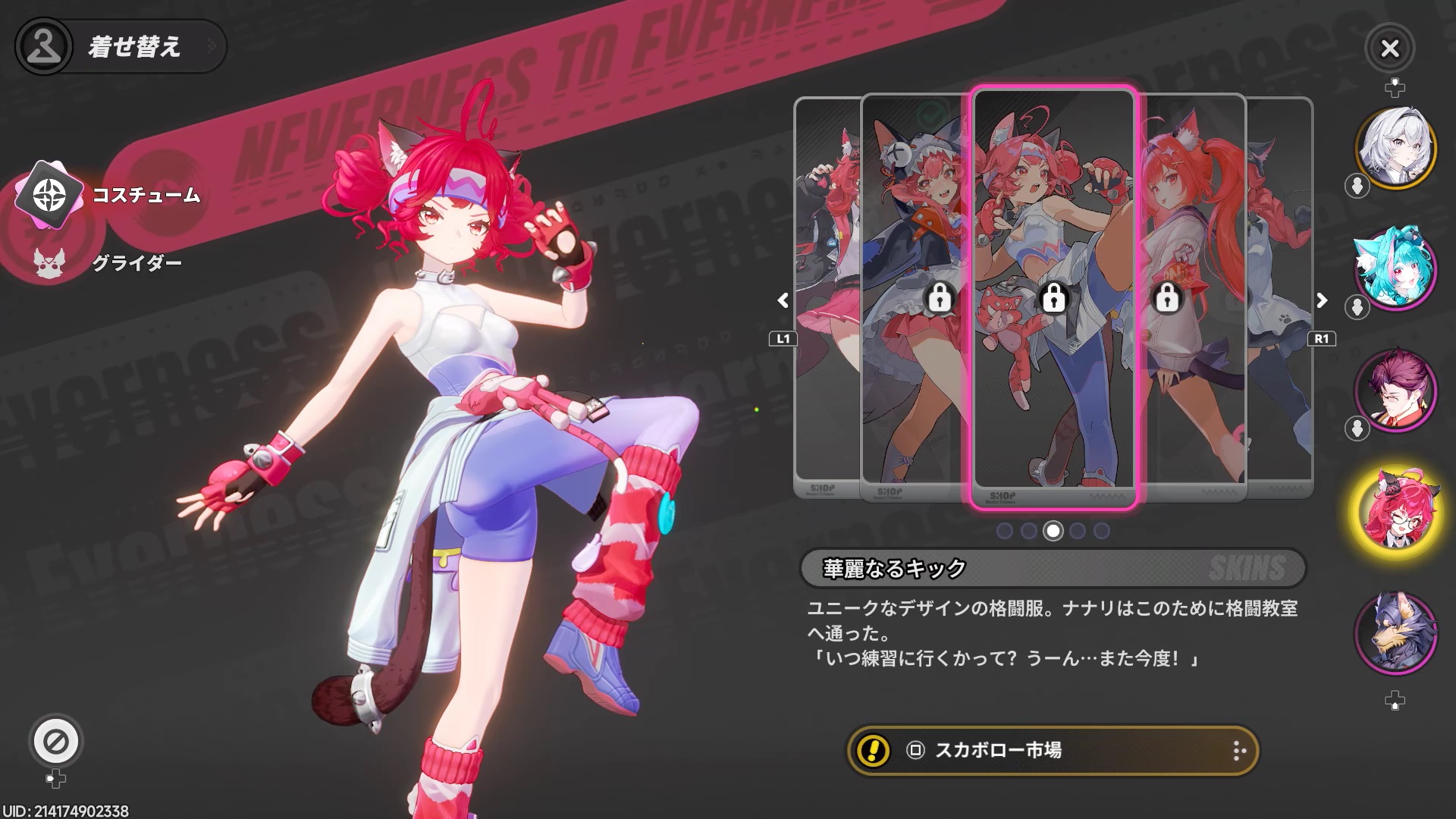 他の衣装についても、ゲーム内マネーで買えるものや課金で手に入るものなど、色々ありました。ベータテストだけあってゲーム内マネーも大量配布されていたため、購入もできましたが、わたしはナナリのデフォルト衣装が好きなので、デフォルトナナリを使っていました。素敵な衣装ですよね。