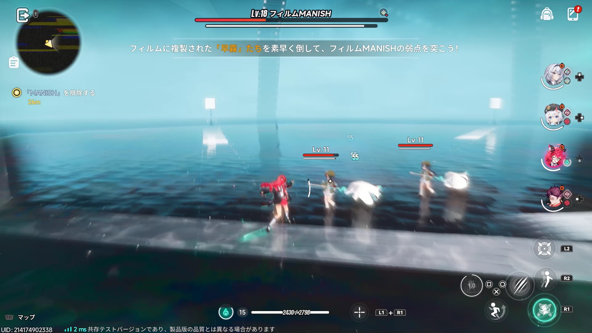早霧の通常攻撃最終段入力直後にナナリに交代することで、疑似的な同時攻撃を行います。