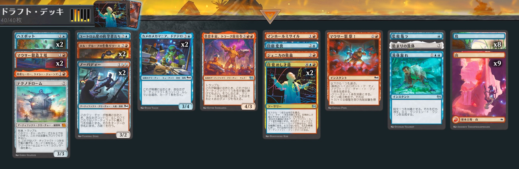 タートルズドラフトの赤青は、コモンカードの多くが安定感に寄与する能力を有しており、何もできなくて負けることが少なく、ある程度やりたいことがやりやすくなっています。