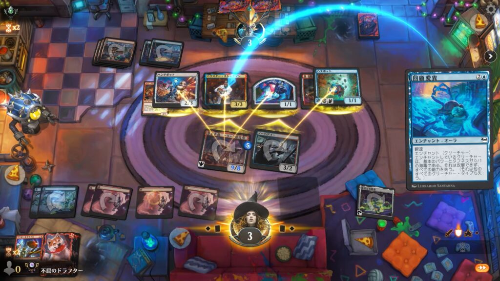 このデッキはレアが「ハクティビスト、エイプリル・オニール」だけなのですが、これがめちゃくちゃ強く、いい塩梅で勝ち筋になりました。アーティファクト・クリーチャー1枚使うだけで2ドローできますからね。ドローはパワーです。