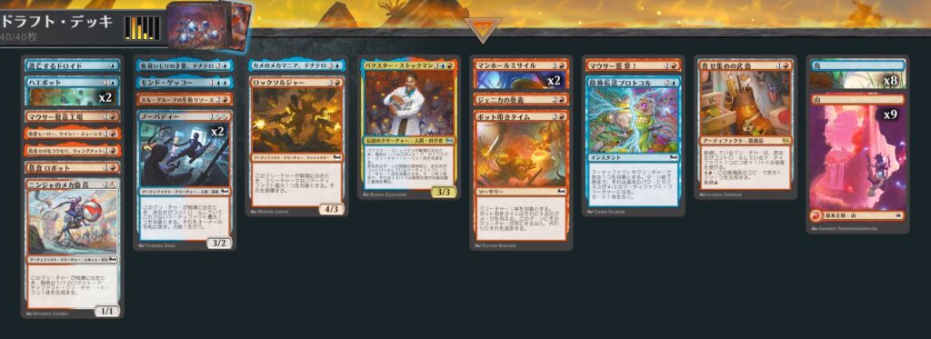 小粒なアーティファクト・クリーチャーを並べやすいカードを多めに拾えたので、それと相性のいいカードも入れて前のめりにした、ちょっと赤白っぽい赤青デッキです。