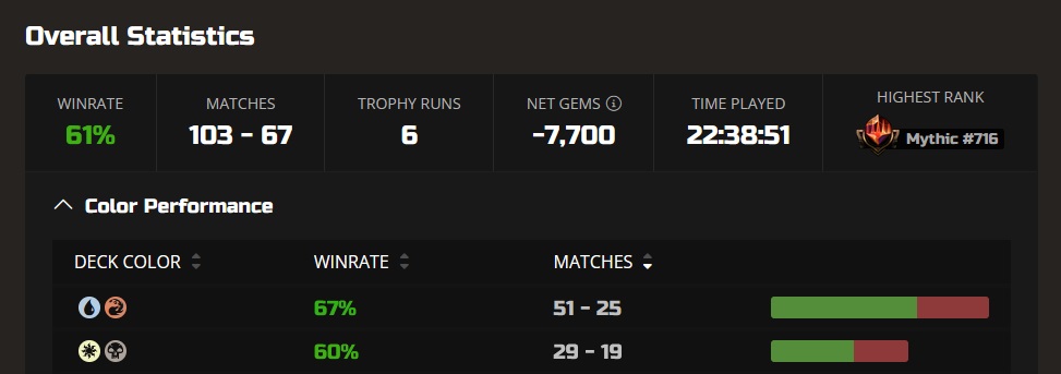 まぁ、これはn=1の戦績なので参考にならないとしても、17landsの統計を見る限り、赤青が上位の強さを有しているのは事実ではないかと思います。