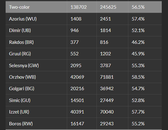 これは17landsのデッキ別勝率のデータですが、2色デッキの平均勝率56.5%に対して、赤青は57.7%です。これはトップの白黒(58.5%)に次ぐ2位の成績です。