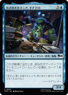 コモンには安牌の擬人化ことカメのメカマニア、ドナテロがいます。ノーバディーは何枚あってもいいですが、こちらは4マナ伝説なので数が要らず、割と流れてくる印象です。だいたい1ドローできて強いです。